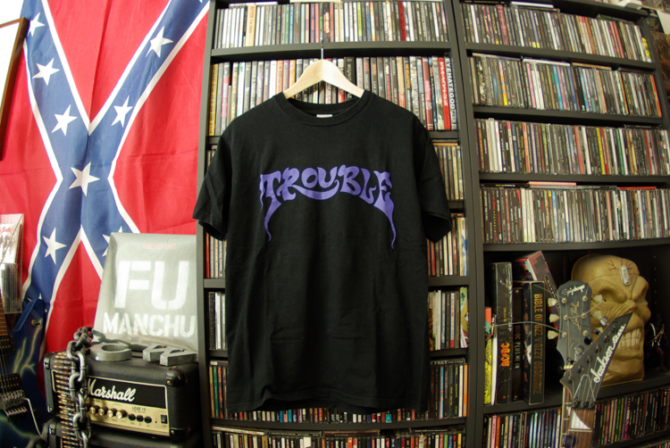 アメリカ産ドゥームメタルバンドTROUBLEのロゴTシャツ。これを着て会社に行くと予期せぬ出来事や徹夜作業、ミスが多発し、Tシャツのせいだと言われるので休日限定のTシャツとなりました。ドゥームに興味を持ち始めたわりと初期に1st「Psalm9」を千葉のディスクユニオンで幸運にも手に入れる事が出来て(当時はまだ再発していなくてひたすら中古を探す以外なかった)、まるでブラックサバスのような1曲目「The Tempter」でガツンとやられました。カビやコケの生えたような湿度の高い音でジメ〜っとしていますがJUDAS PRIESTなどの影響もちらほら見え隠れしザクザクしてる部分もあるのでCANDLEMASSやSolitude Aeturnusほどカビ全開ではないです。サバスのように1曲の中でリズムチェンジする曲が多く、出だしがつまらないからと飛ばすと損します。ヴォーカルがわりと高音でメタル特有のダサさ全開ですがこれが良いのです。この後の2nd、3rdはイマイチですがリックルービンのDef American Recordsに移籍してストーナー路線に変更した4th以降はこれまた最高の曲がちょいちょいあります。恐らく4th「Trouble」(1990)の「Psychotic Reaction」や「Black Shapes Of Doom」はCATHEDRALの2nd「The Ethereal Mirror」(1993)のMIDNIGHT MOUNTAINなどに多大なる影響を与えたのではないかと思える部分がたくさんあります。去年、久々にアルバム「Distortion Field」を出しましたがVoが元Exhorder、Alabama ThunderpussyのKyle Thomasに変わっていてギターリフなんかは、TroubleっぽいのですがVoがパワフルすぎて…。